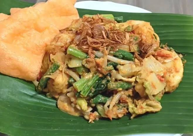 5. Tambahkan Pelengkap: Taburi lotek dengan bawang goreng dan sajikan bersama kerupuk udang atau emping melinjo.