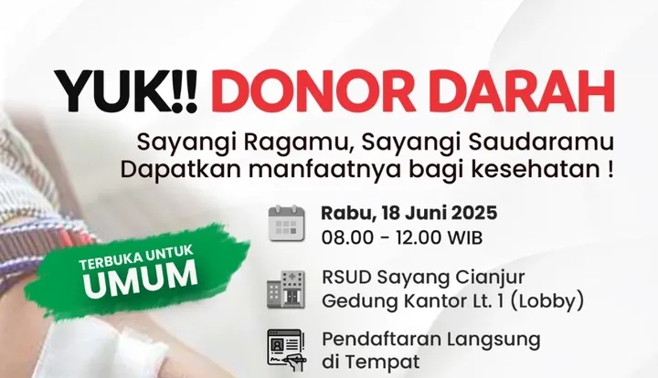 Acara ini bakal digelar pada Rabu, 18 Juni 2025, mulai pukul 08.00 hingga 12.00 WIB di lobi Gedung Kantor RSUD Sayang, Kabupaten Cianjur.