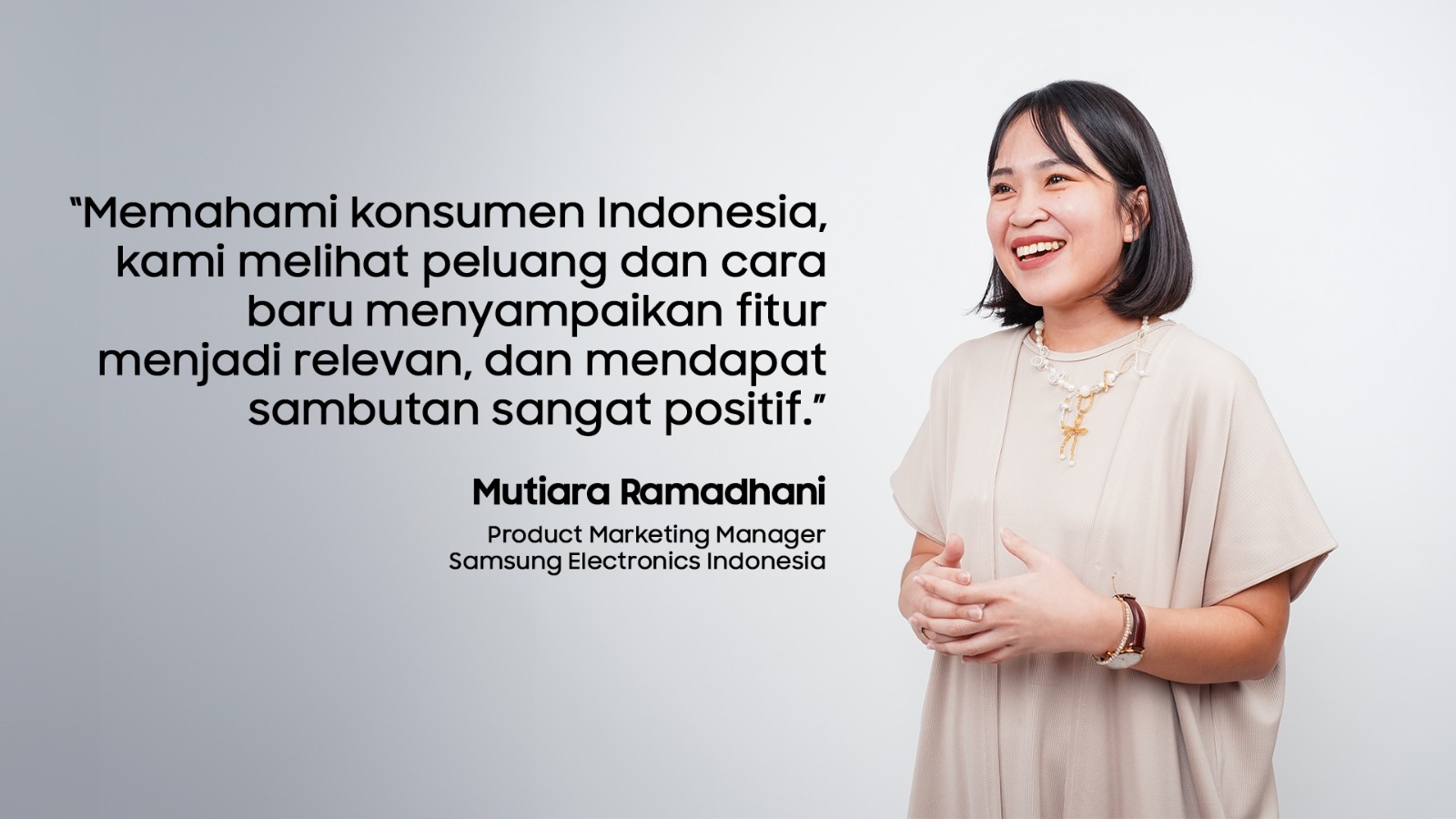 Sejalan dengan Alishia dan Ima, Mutiara Ramadhani, yang mengawali kariernya di Samsung Electronics Indonesia melalui program Management Trainee, juga terus menggali insight dari masyarakat dan pengguna produk elektronik rumah tangga di Indonesia. Ia melakukannya melalui berbagai cara, mulai dari menganalisis percakapan di media sosial, melakukan survei mendalam, hingga berbicara langsung dengan konsumen.