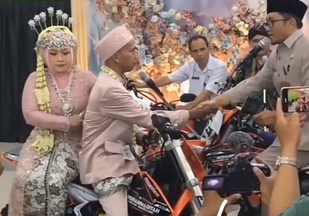 Video viral tersebut memperlihatkan momen saat pengantin pria duduk gagah di motor trail, sambil menjabat tangan penghulu. Sedangkan pengantin wanita, berada menyamping di belakang motor.