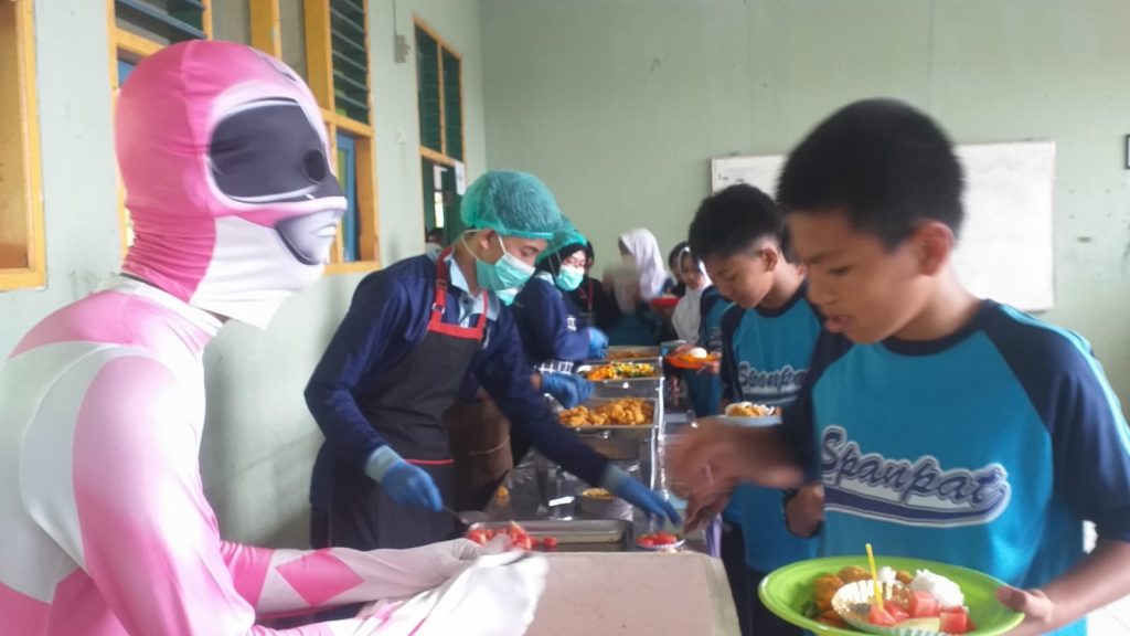 Dengan jubah berwarna cerah dan topeng khas tokoh pahlawan, para petugas menyapa siswa sambil menyajikan makanan. Suasana pun berubah lebih ceria. Gelak tawa terdengar saat para “superhero” itu mengingatkan siswa untuk mengambil porsi seimbang dan tidak menyisakan makanan.