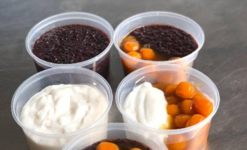 Jelly buah dengan potongan buah segar seperti naga, mangga, dan stroberi tidak hanya menarik secara visual, tetapi juga memberikan kesegaran alami setelah berpuasa.