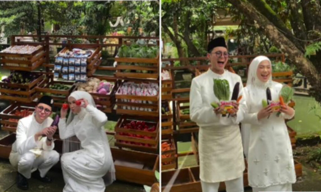 Alih‑alih memberikan souvenir pernikahan biasa, pasangan pengantin penyelenggara acara Putra dan Elsy yang menikah pada 15 Februari 2026, memilih menyediakan rak kayu estetik menyerupai “pasar tumpah” mini yang dipenuhi dengan sayuran segar.