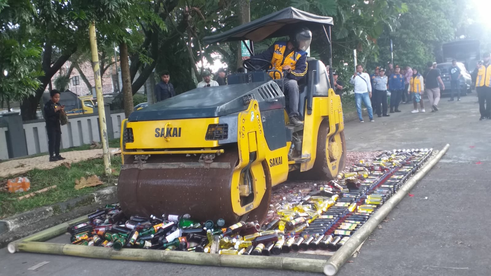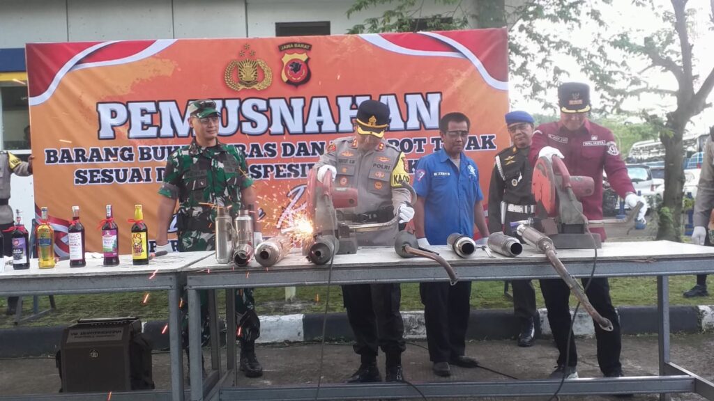 Selain miras, petugas juga memusnahkan 250 knalpot yang tidak sesuai spesifikasi teknis (brong).